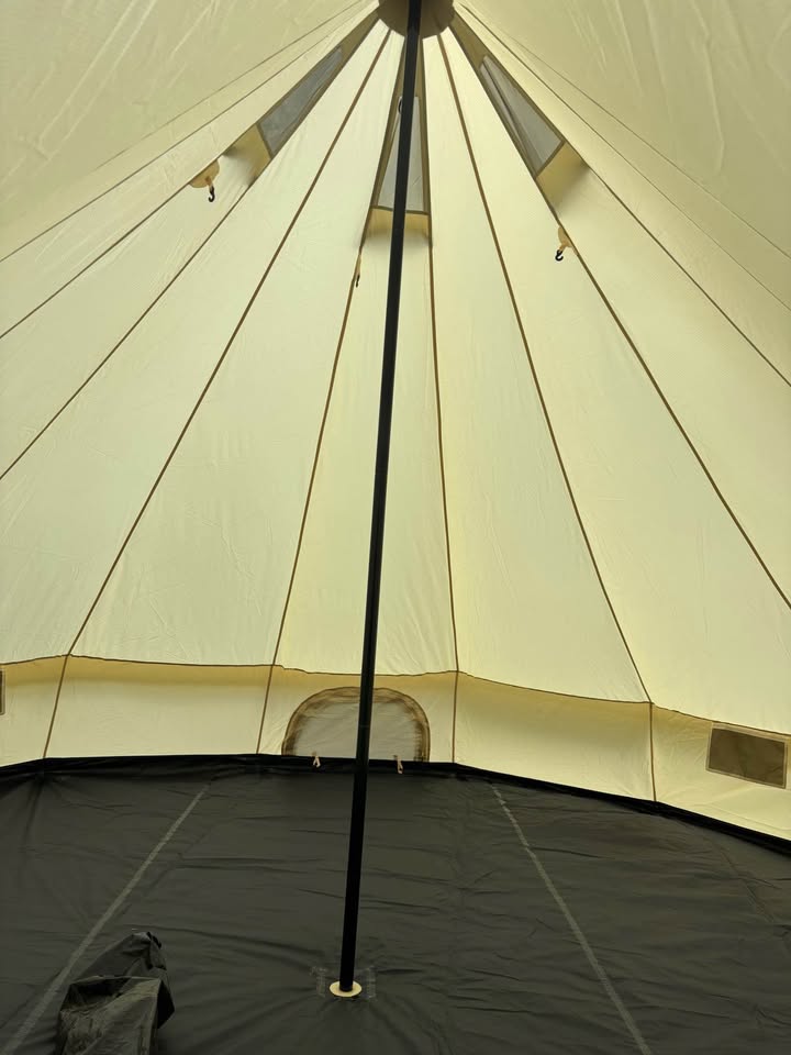 Klokketeltet er opbygget med en stabil midterstang, der giver maksimal loftshøjde og god rummelighed, mens en solid A-ramme former og støtter den store indgang. Indgangen er udstyret med myggenet, så teltet kan stå åbent på varme dage og give optimal ventilation uden uønskede insekter.